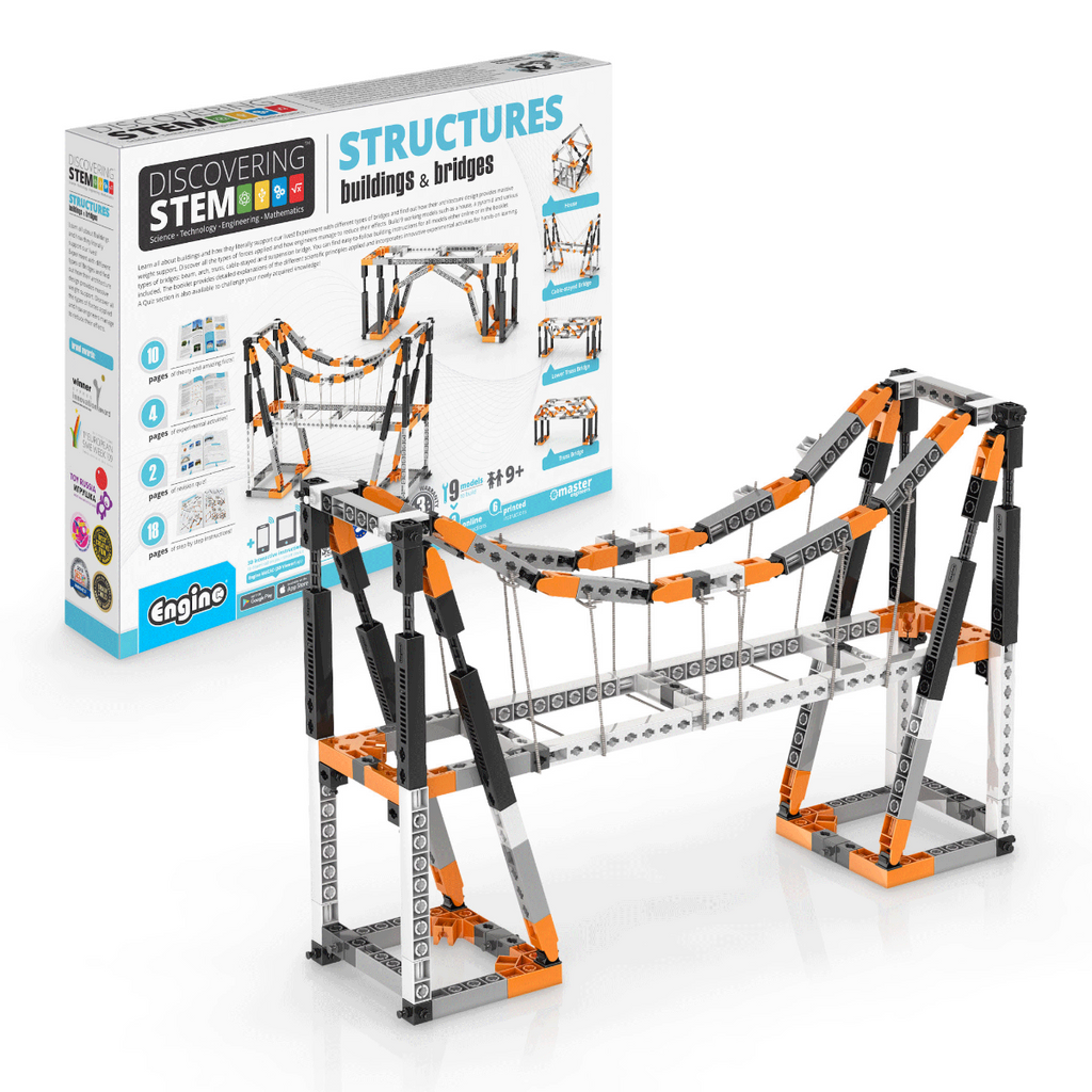 Learn all about buildings and how they literally support our lives! Experiment with different types of bridges and find out how their architecture design provides massive weight support. Discover all the types of forces applied and how engineers manage to reduce their effects. Build 9 working models such as a house, a pyramid and various types of bridges: beam, arch, truss, cable-stayed and suspension bridge. You can find easy-to-follow building instructions for all models either online or in the booklet included. The booklet provides detailed explanations of the different scientific principles applied and incorporates innovative experimental activities for hands-on learning. A Quiz section is also available to challenge your newly acquired knowledge!
